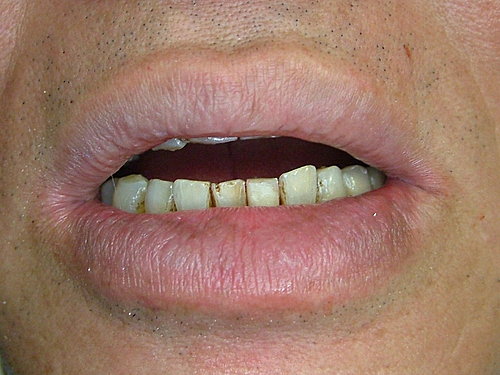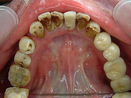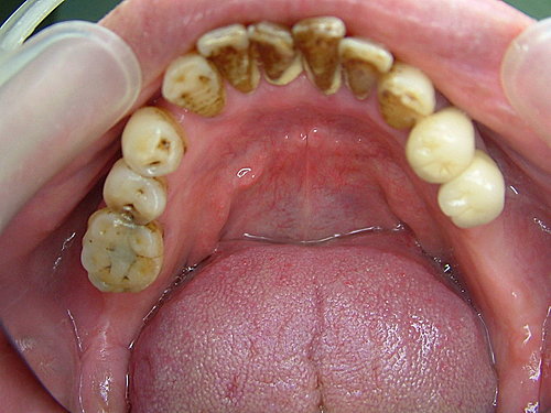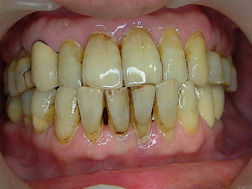 裝上假牙 大功告成 .... 拜託 !牙齒還是沒刷 看到一層厚厚的牙結石 .... 總不能天天來診所洗牙吧!